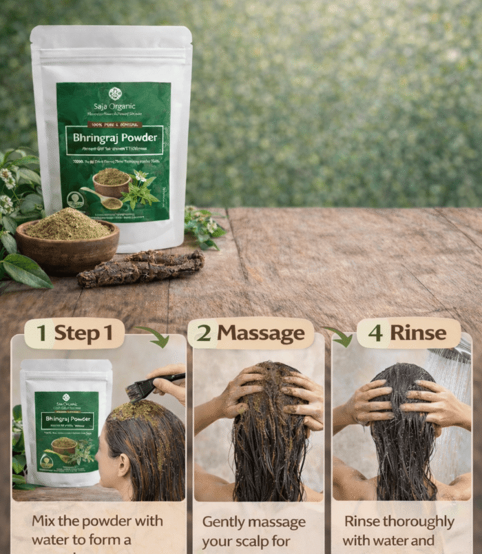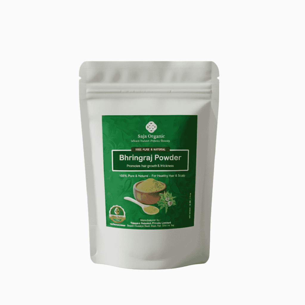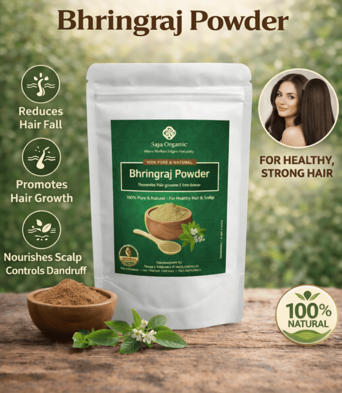 Saja Organic Bhringraj Powder 100g is a 100% pure and natural Ayurvedic hair care powder that helps reduce hair fall, promote hair growth, and strengthen roots. It nourishes the scalp, controls dandruff, and supports healthy, shiny hair. Ideal as a chemical-free solution for all hair types.