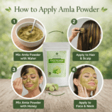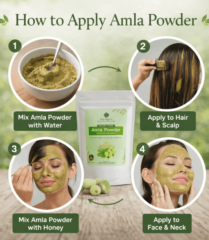 Mix amla powder with water, yogurt, or oil to form a paste. Apply to scalp and hair, leave for 20–30 minutes, then rinse thoroughly.