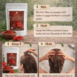 This herbal powder helps strengthen hair roots, reduce hair fall, and support thicker, fuller hair. It also works as a natural conditioner, leaving hair soft, smooth, and shiny. Regular use can help control dandruff, nourish the scalp, and prevent dryness, making it suitable for all hair types. Hibiscus powder is also beneficial for skin care, helping to gently cleanse, exfoliate, and improve skin glow.