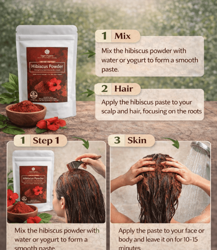 Choose Saja Organic Hibiscus Powder for a natural, effective way to achieve strong, shiny hair and healthy, glowing skin.