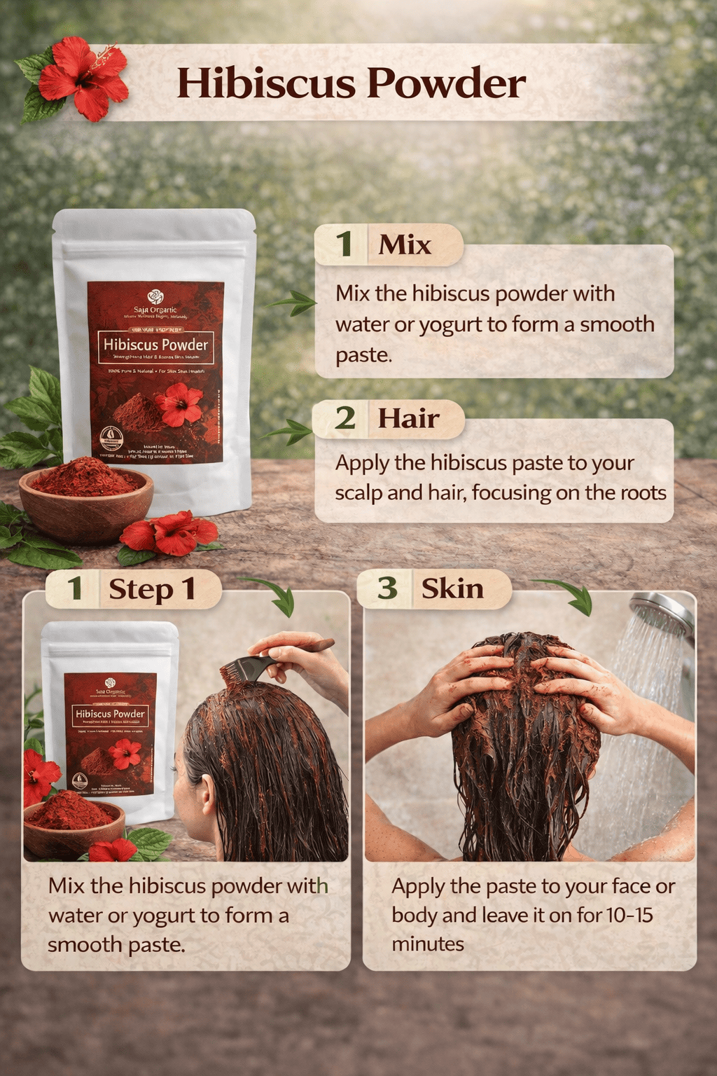 Saja Organic Hibiscus Powder can be used as a hair mask or mixed with other Ayurvedic ingredients like amla, reetha, or shikakai for enhanced results. It deeply nourishes and revitalizes hair while supporting scalp health naturally.
