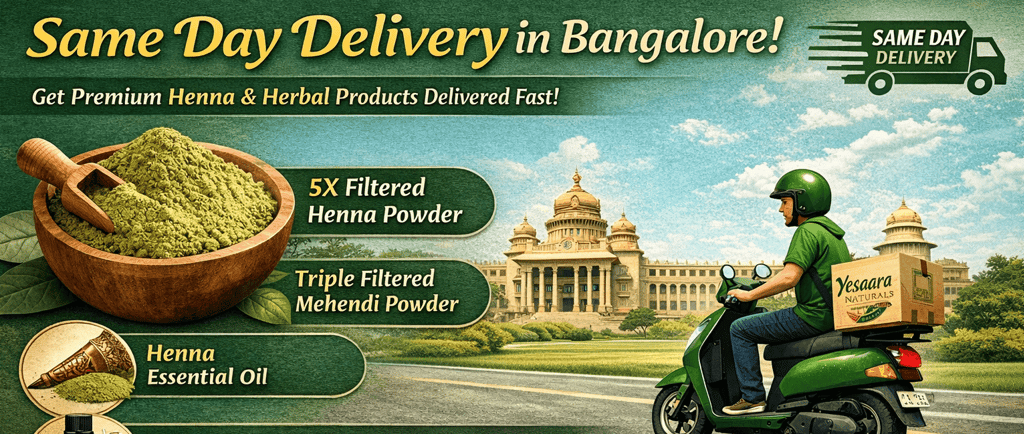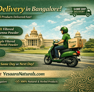 Looking for same day delivery of natural henna and herbal products in Bangalore? Yesaara Naturals is your trusted destination for premium-quality henna, mehendi powder, and herbal essentials, now available with same day and next day delivery across Bangalore.